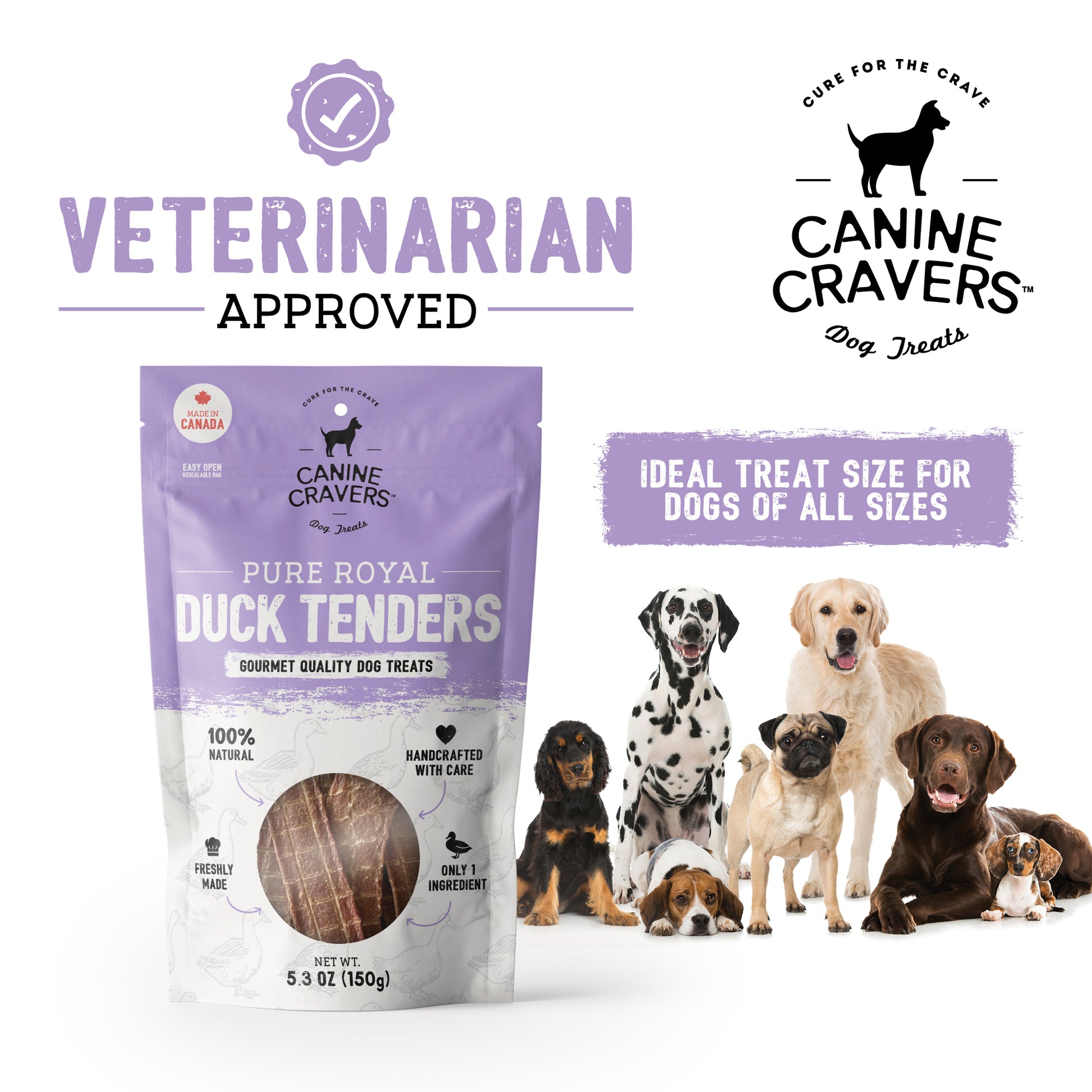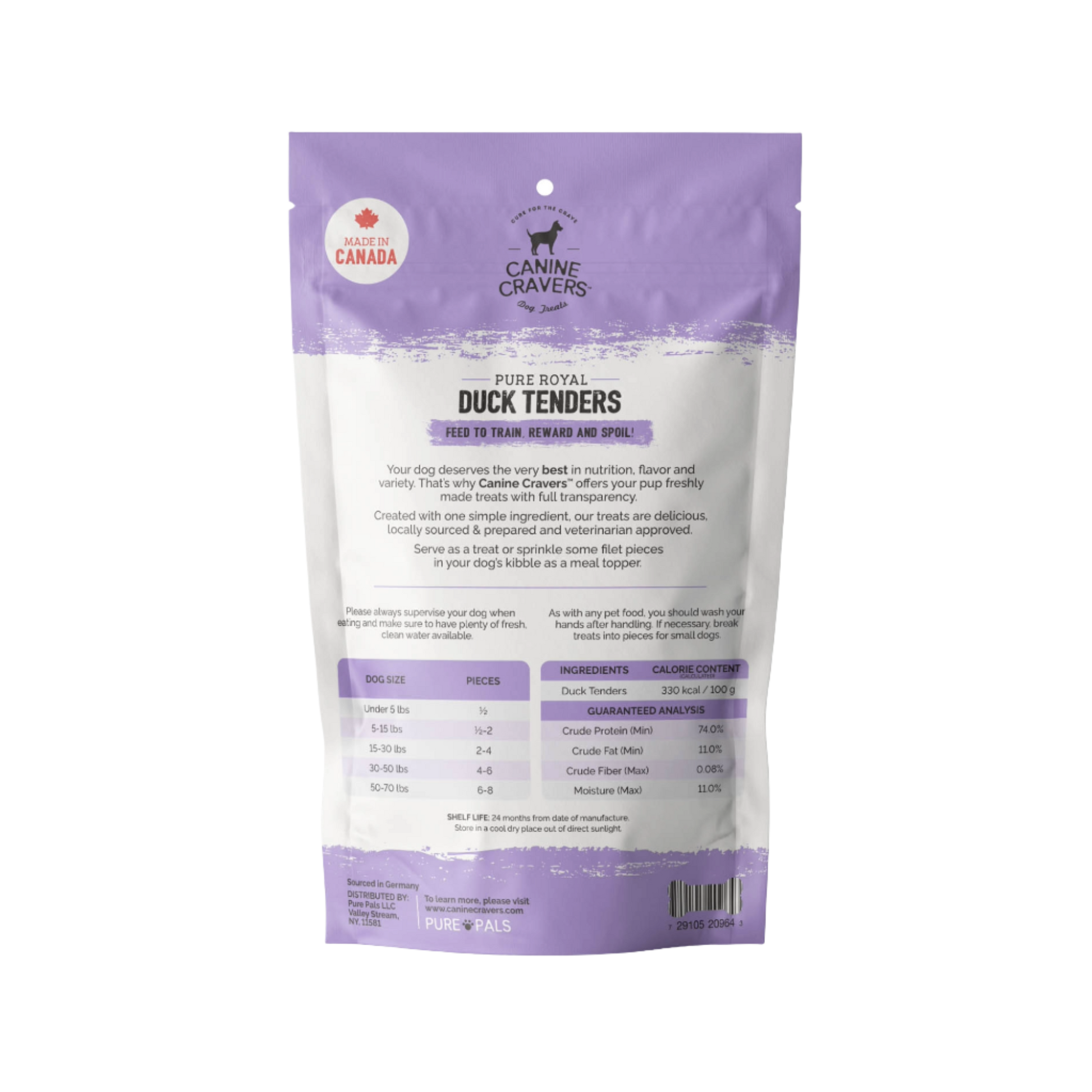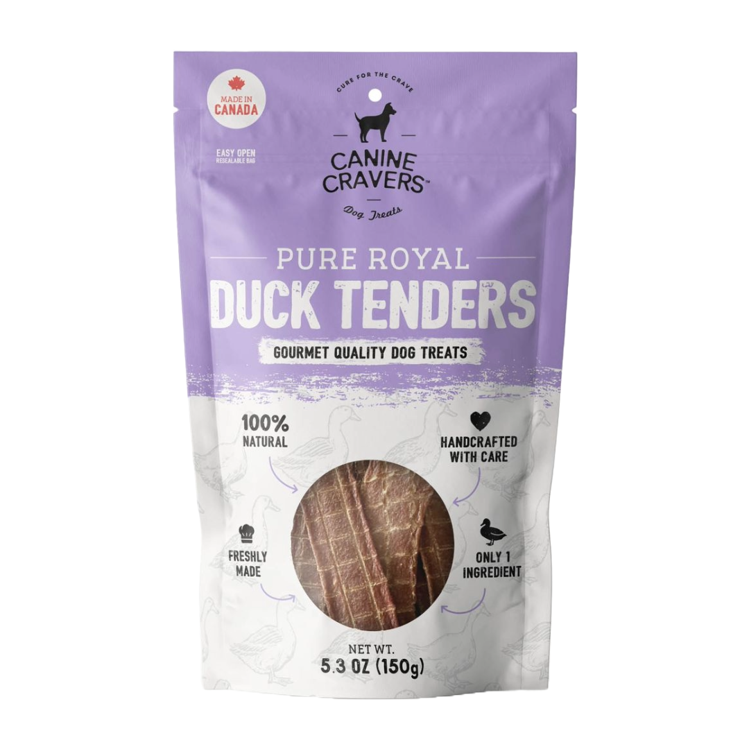 - DUCK. ONLY DUCK: Don’t let your dog eat preservatives, additives and by-products. Our protein rich Duck Tender strips are made with just one ingredient. Our pure royal duck treats are grown and harvested in Germany, 100% traceable while being air dried and made in Canada. So you can rely on premium quality.